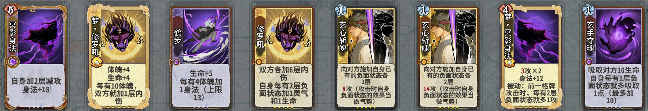 梦修罗+修罗吼:正反吼,我很喜欢的一个套路,利用梦修罗给负面,修罗吼给灵气,能够直接给大量负面和灵气,不管是后置梦荷重防守、梦冥影加伤还是接梦金书或梦冲加体魄或者身法,都能提供大量的负面和灵气,不管是修玄还是百杀,都是很优质的起手,高额内伤也让锻玄一圈杀能力大大增强,就是容易给自己毒死。