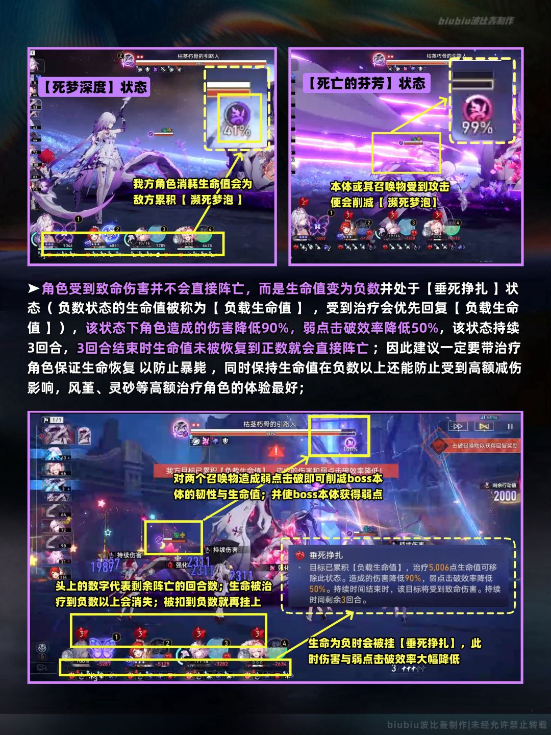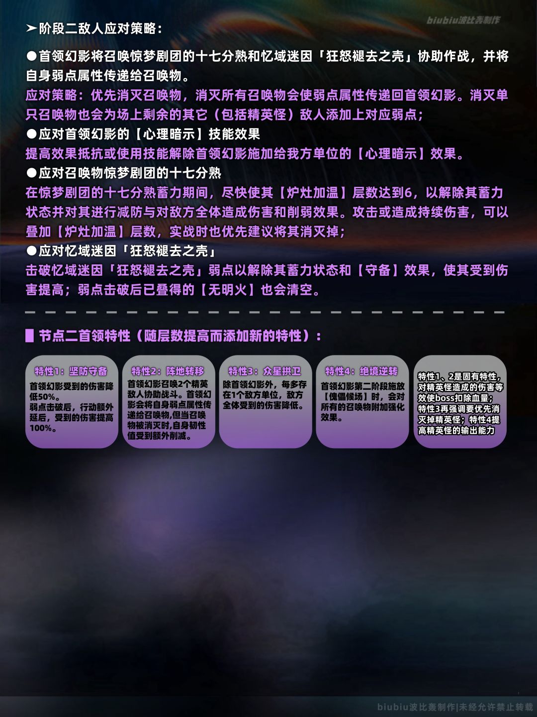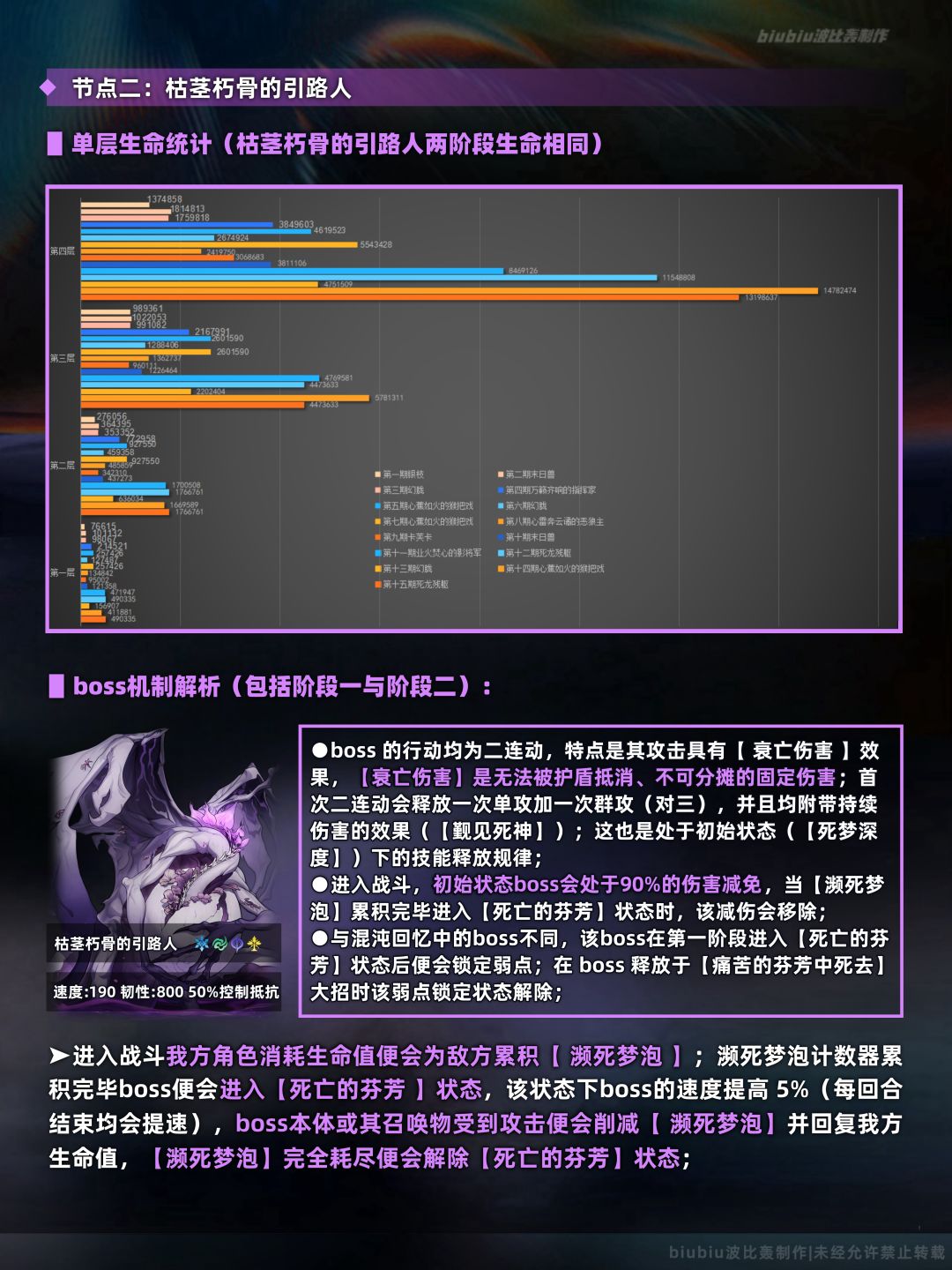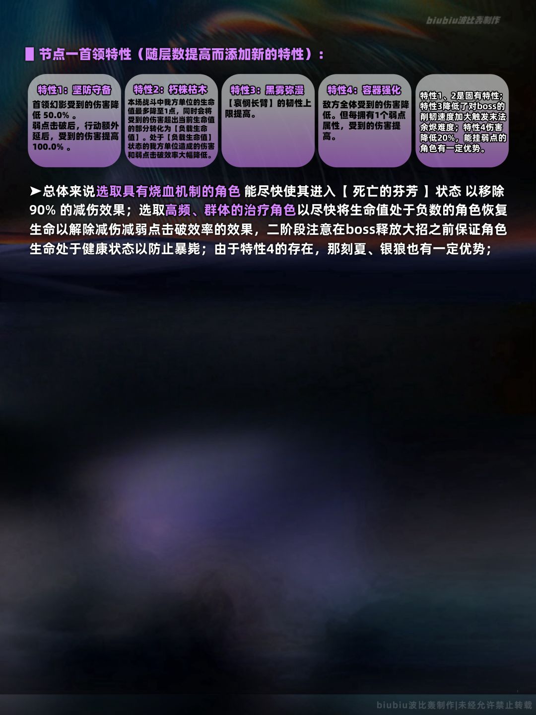 本期上下间的两名敌人我们同样也是在往期已经遇到过了,其机制特点依旧没有发生改变,改变的地方是其血量及输出有所提高;其中需特别注意下半间的死龙残躯,其总体机制与混沌回忆中的差距不大,特点是多了【负载生命值】这一机制,刚需治疗角色在我方生命值处于负值时尽快回复生命以防止暴毙,或对召唤物造成弱点击破也能恢复生命;另外具有烧血机制的角色能够尽快使其进入【死亡的芬芳】状态以移除90%的减伤效果,故可优先考虑;