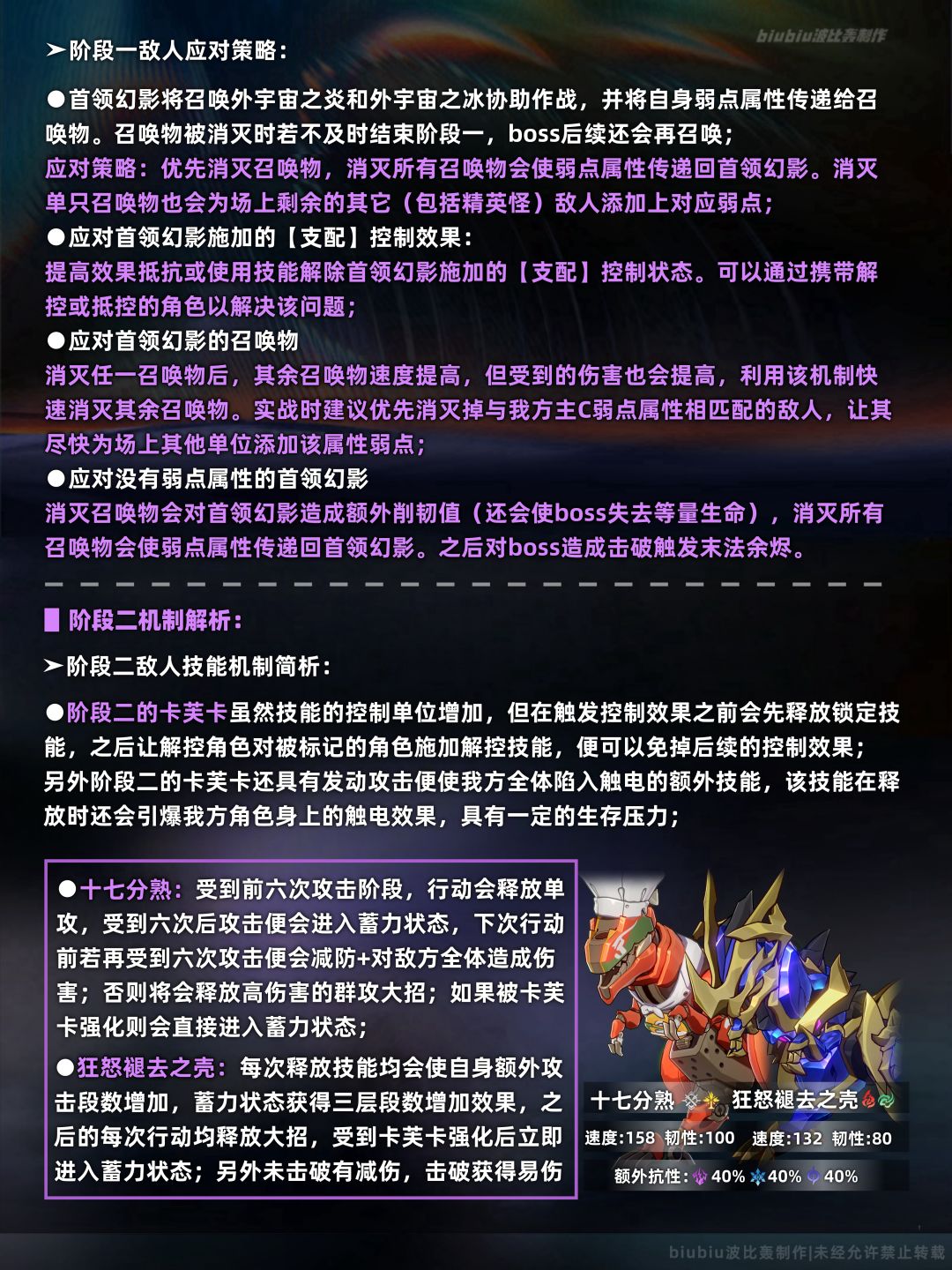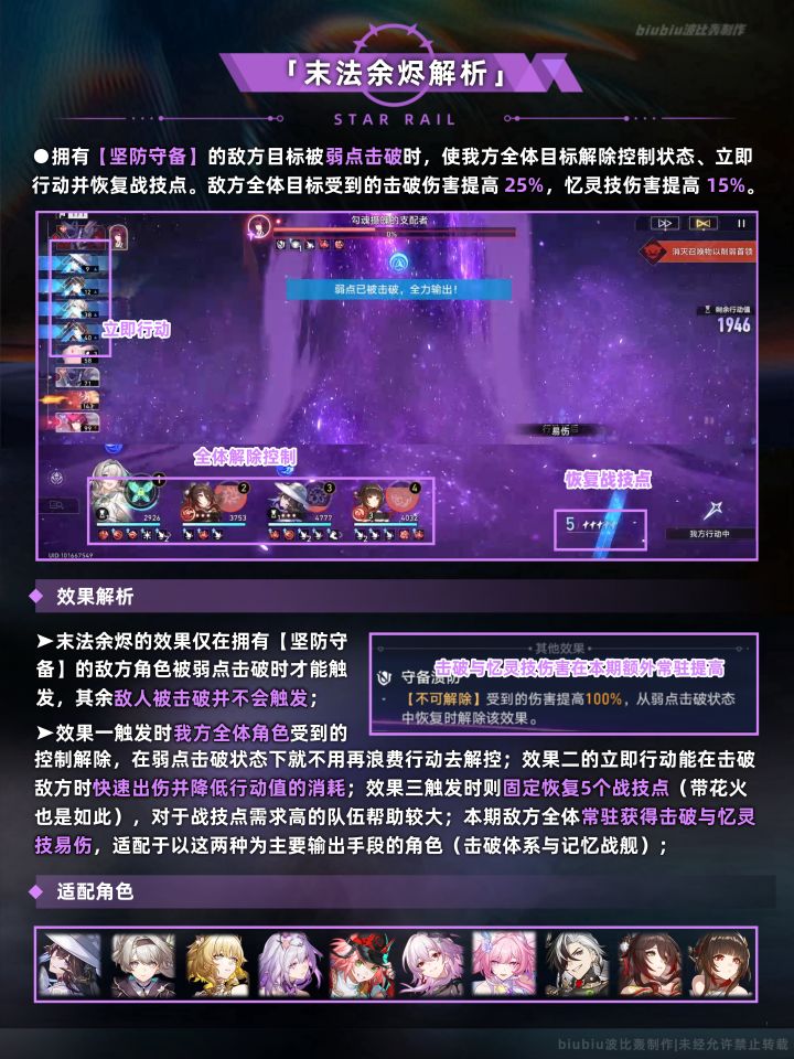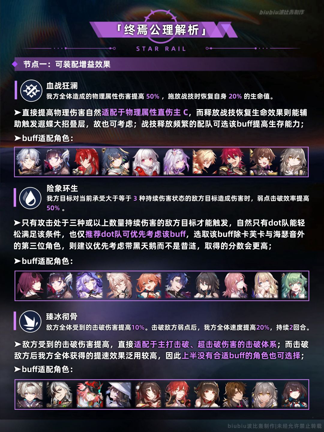 大buff较适合击破与记忆体系,这两种体系在本期也能取得很高的分数;上半需注意小buff泛用性有限,没有合适buff的配队可考虑buff3,提速对于末日幻影这样统计行动值的关卡也有一定效果;下半则需注意buff2会与死龙残躯的机制相吻合;主打战技输出的体系可优先考虑;