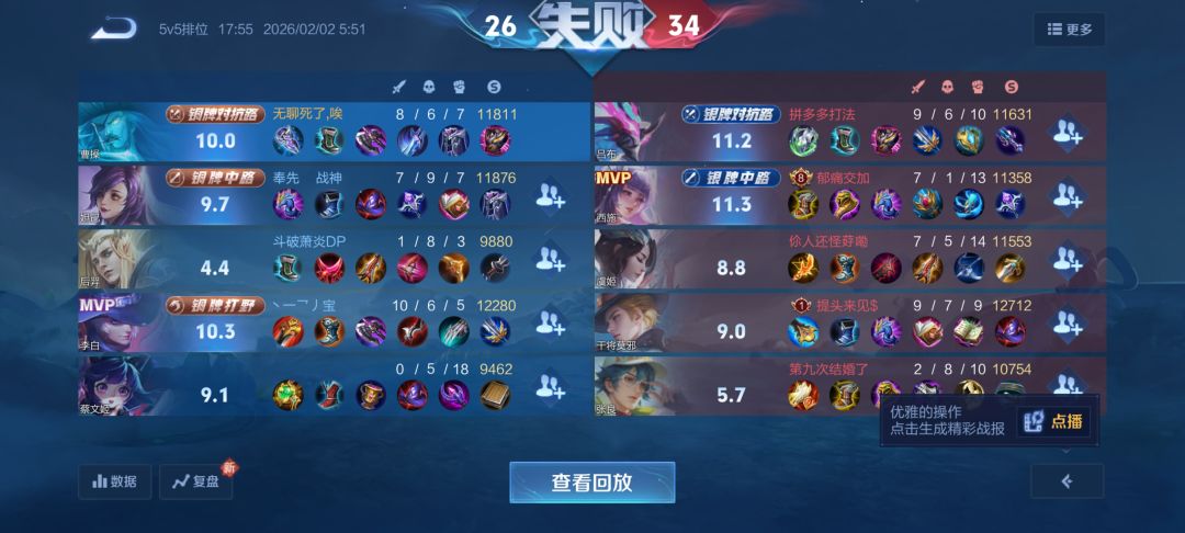 第二第2把1楼是打野,我禁个盘古,他问我为啥要禁?我说你又没预选,我不禁他干鸡毛啊,还跟我两个扯。四五楼好像射手又选个米老鼠吃分,要伤害没伤害的,你选个蛋啊,又不是绝活哥。你牛逼,你能带我赢,我不说啥,你玩成这样。打团了一点伤害都没有,连人都打不动。打完一看伤害我都还比他高3%😂。射手跟辅助伤害就比他低了4%我去,我真服了。而且对面射手经济跟我们射手比,笑死我了。特别是中期,我跟打野都切了好几次对面射手。不说你经济比他高,你经济跟他一样,实在不行差个两三百,我都认。你这我是真没话说了,只要选了马可米老鼠的,大概率必输。绝活哥历害的除外。