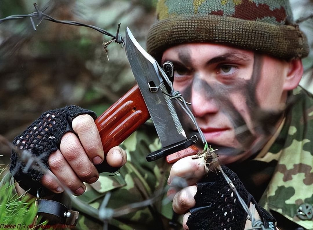 正在用6Kh3切断铁丝网的士兵6Kh3军刀除了可以装配到步枪上作为刺刀,也可以作为近战格斗的匕首,其刀柄配皮质护手带,徒手格斗时防脱落,提升握持稳定性。刀身椭圆孔与刀鞘凸轴组合成 “剪刀” 结构,配合刀鞘绝缘橡胶垫与 AG-4V 电木 / 玻纤绝缘刀柄,可剪切带电铁丝网、通信电缆,适合战场破障与敌后作业。刀背带金属锯齿,能锯断细钢筋、木材,可以满足野外搭建、维修与应急破拆需求。