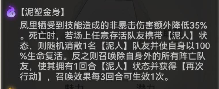 。舞形态凤里栖的[泥人]状态无视禁活,极大提高了队伍的生存能力,通关视频中up主的阿璃在第十五回合被禁活了,但凭借凤里栖的[泥人]效果在后续依然站起来三次,这也是up主通关的关键所在。