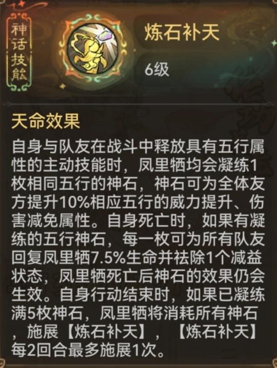 注:携带松风或者三阶羽是为了集齐五行神石触发凤里栖的[炼石补天],三阶羽和松风书录二选一即可,使用其他舞姬或凤里栖达到仙二则采用[烟花+山海+二阶木]。