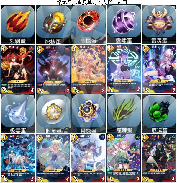 各级地图龙蛋及其对应人形一览图根据卡牌属性排序。版本更新后我们将会第一时间更新一览图。