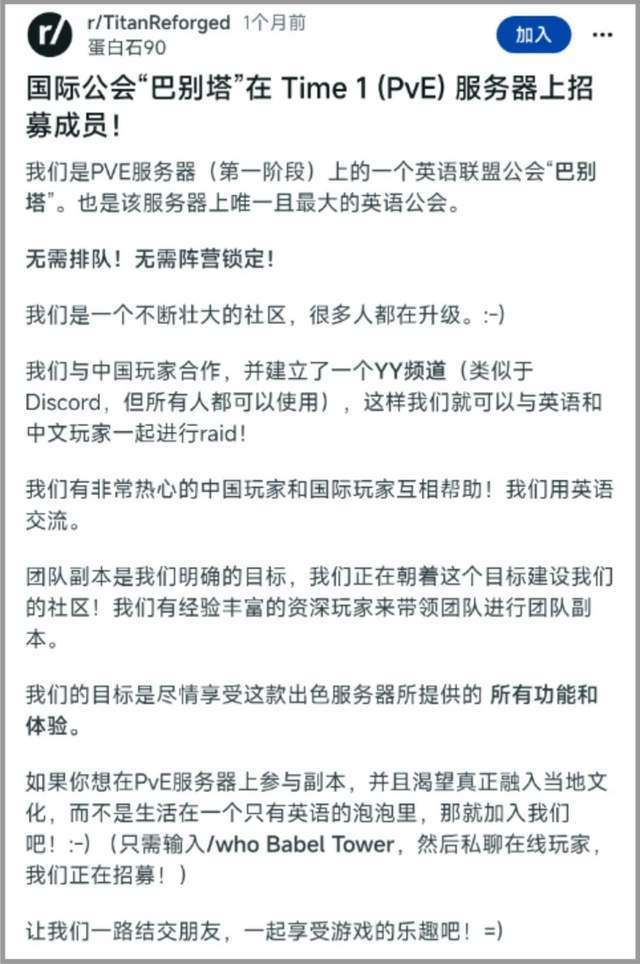 一个名为“Babel Tower”(巴别塔)的国际公会,在Reddit上发布招募帖。他们的口号很有意思:“我们与中文玩家合作,并建立了一个YY语音频道,目标是想要真正融入当地文化,而不是活在纯粹的英语泡泡——也就是信息茧房里。”