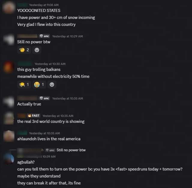 这种基础设施上的打击,让一些老外玩家忍不住恰柠檬了,阴阳怪气地调侃,“咱这个网速才符合第三世界国家的标准,羡慕中国老哥强悍的国家电网”。