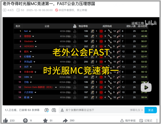 不止如此,这帮老外还顶着起号慢、参与晚的压力,凭借独特的游戏理解,上来就在熔火之心的竞速榜上打出42分45秒,一度登顶国服,狠狠打了所有国服玩家的脸。