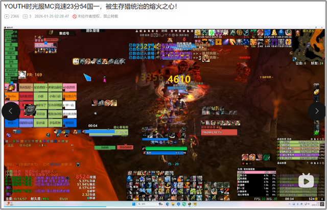 于是国服公会YOUTH也不甘示弱,终于在1月25日,凭借一套出人意料的生存猎战术,一群猎人站桩输出,把Boss站在地上摩擦,以23分54秒的成绩刷新纪录,拿回榜首。