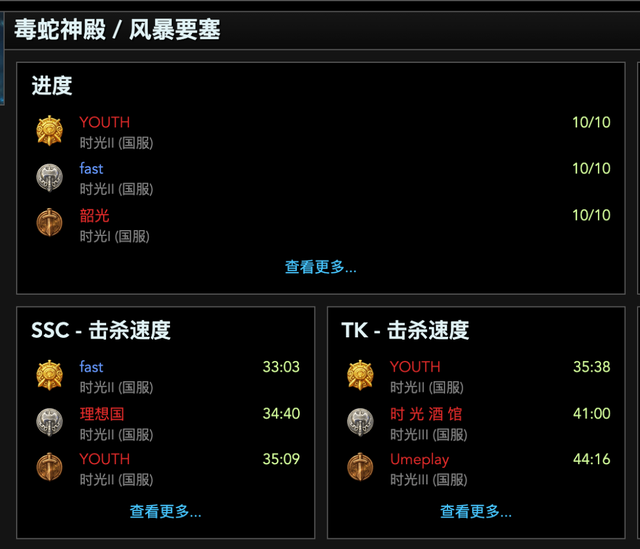 FAST 公会:以顶尖玩家为主,审核严格到要查过往竞速成绩,专门冲首杀和竞速,一阶段差点拿下第一,这次野心不小;Guest Gamers:主播水友公会,谁都能加,包括说英文的中国人,现在已经满1000 人,不得不分了个叫GGs的分会,专门冲进度,实力也不容小觑;High Class:美服时间为主的竞速团,虽然组织得晚,但也打进了40分钟,和现在的国服中游公会水平差不多;Wooddepartment:部落的PVP公会,一群老外就喜欢部落的 “反派气质”,平时主打竞技场和战场,偶尔也会凑一起打团本。