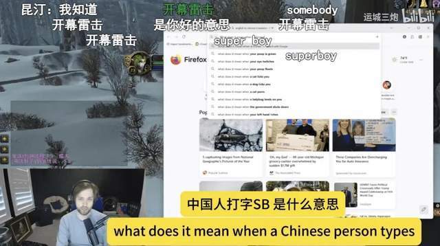 那时候,满屏的111、NB、==(等等)和翻译器CPU过载的场面,像是一场老外出现人传人现象导致的大型文化交流观光会。你会看到,全网千万粉丝的大主播Sodapoppin把SB当成“帅比”记小本本,也有人连嗑瓜子都要追问“中国人为什么吃太阳花种子”。