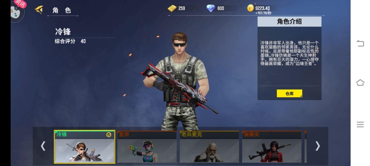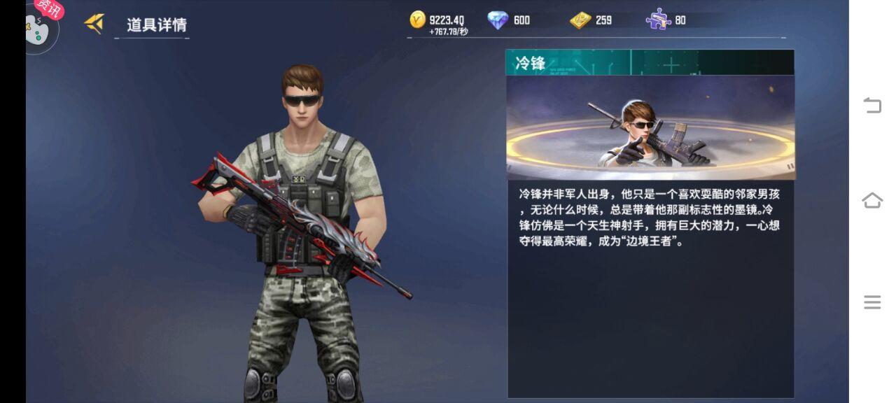 ①冷锋并非军人出身,他只是一个爱耍酷的邻家男孩,无论什么时候冷锋都喜欢带着他那副标志性的墨镜,冷锋仿佛是一名天生的神射手,具有巨大的潜力,冷锋一心想夺得更高的成就和荣耀,成为一个“边境王者”!
