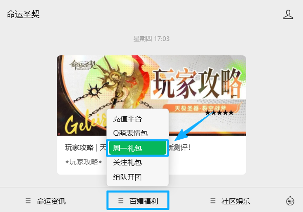 每周一上午10:00更新周一礼包,内含游戏道具!团长别忘了关注《命运圣契》公众号,每周来领取喔!
