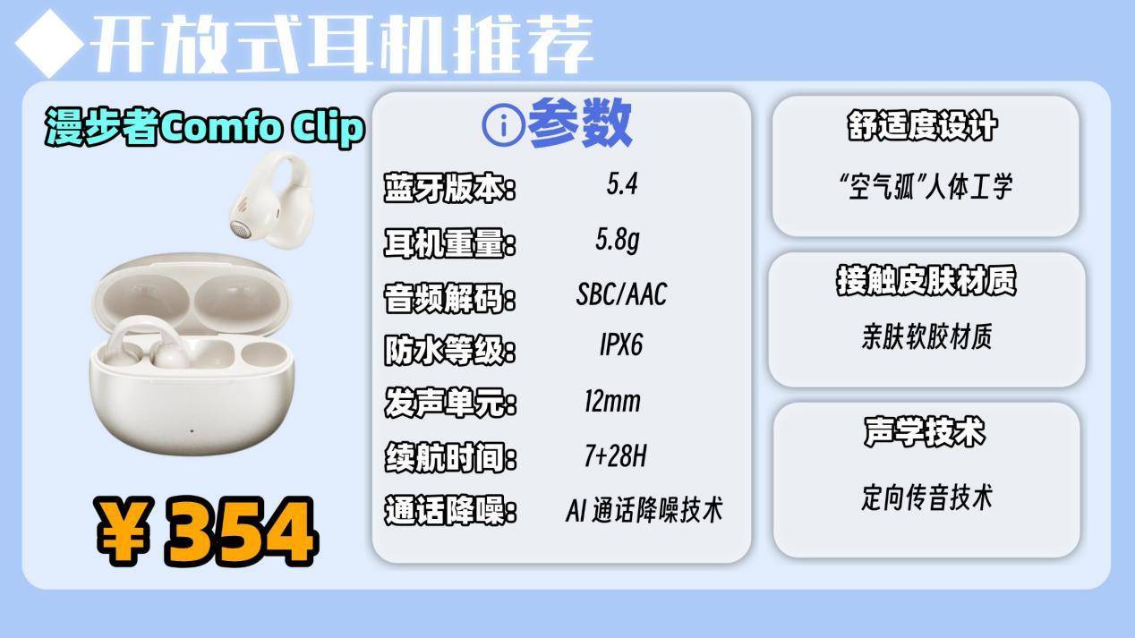 推荐六:漫步者 Comfo Clip开放式耳机(354元)