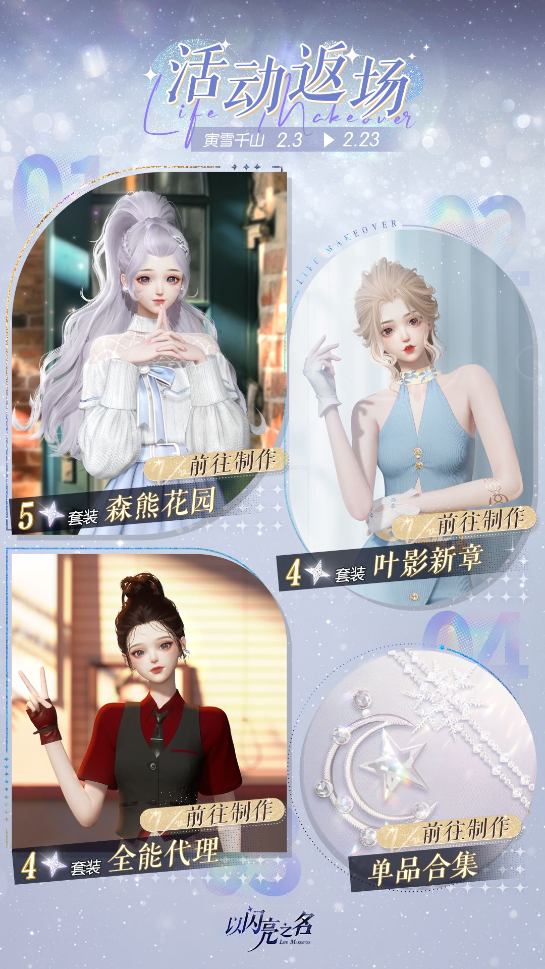 1.返场期间,时装工作室【活动返场】新增【寅雪千山】限时制作,可以在这里制作错过的活动时装和外观啦~