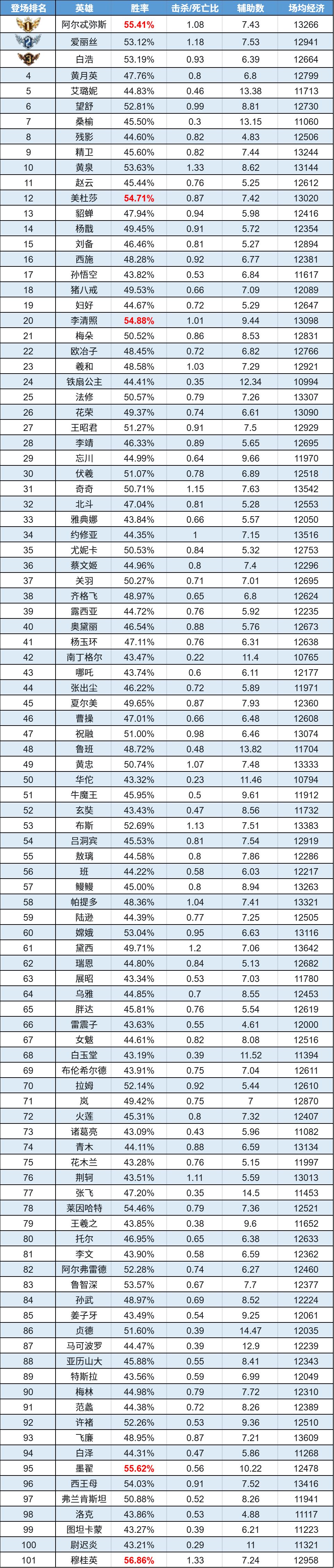 排序:按登场率高低排序,标红为胜率前5