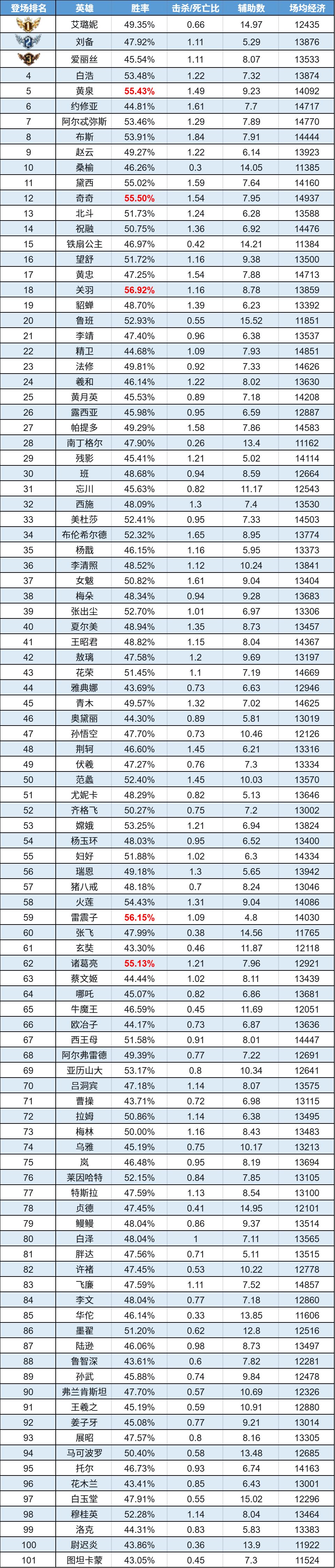 【高段位】艾璐妮与刘备稳居登场前二;胜率榜迎来新霸主——关羽,超越长期霸榜的黛西与黄泉;奇奇继续垄断场均经济第一。