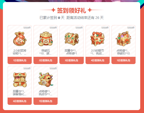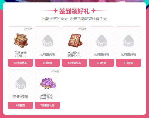 累计签到1、3、7天还能额外获得更多「武将自选礼包」「点将谱」「招募令」哦!限时加码福利,别忘了领呀~