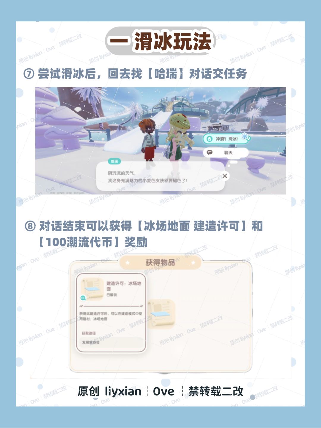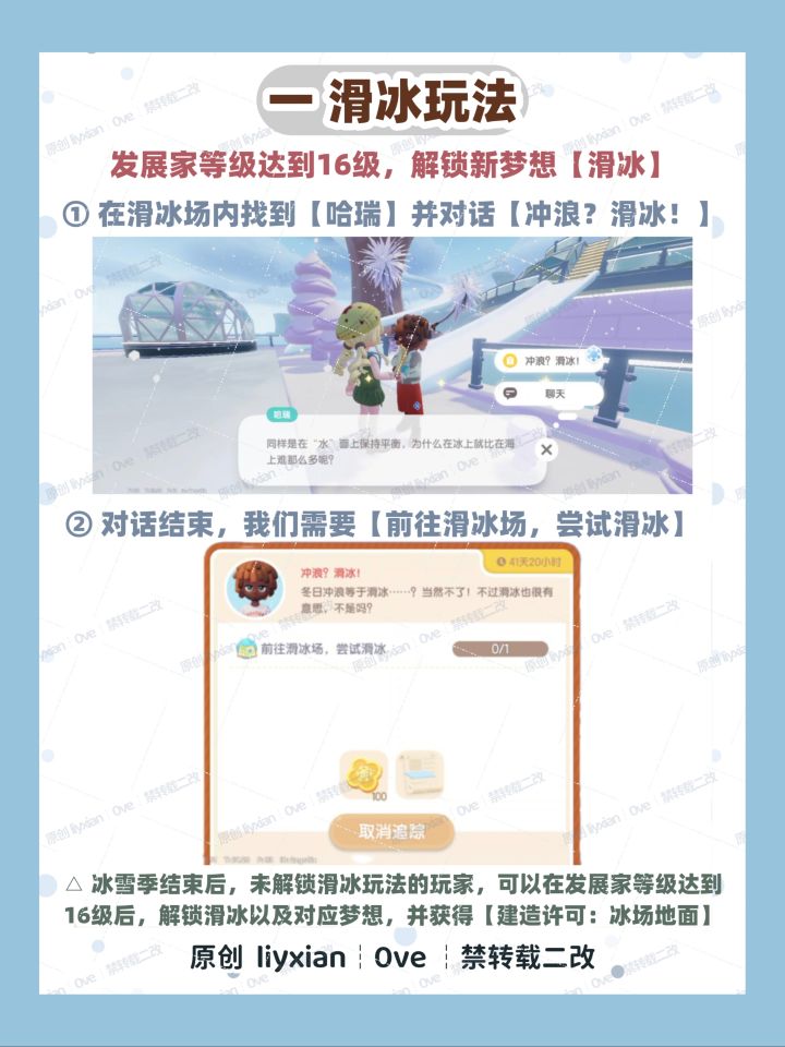 △ 冰雪季结束后,未解锁滑冰玩法的玩家,仍然可以在发展家等级达到16级后解锁滑冰及对应梦想,并获得建造许可:冰场地面。