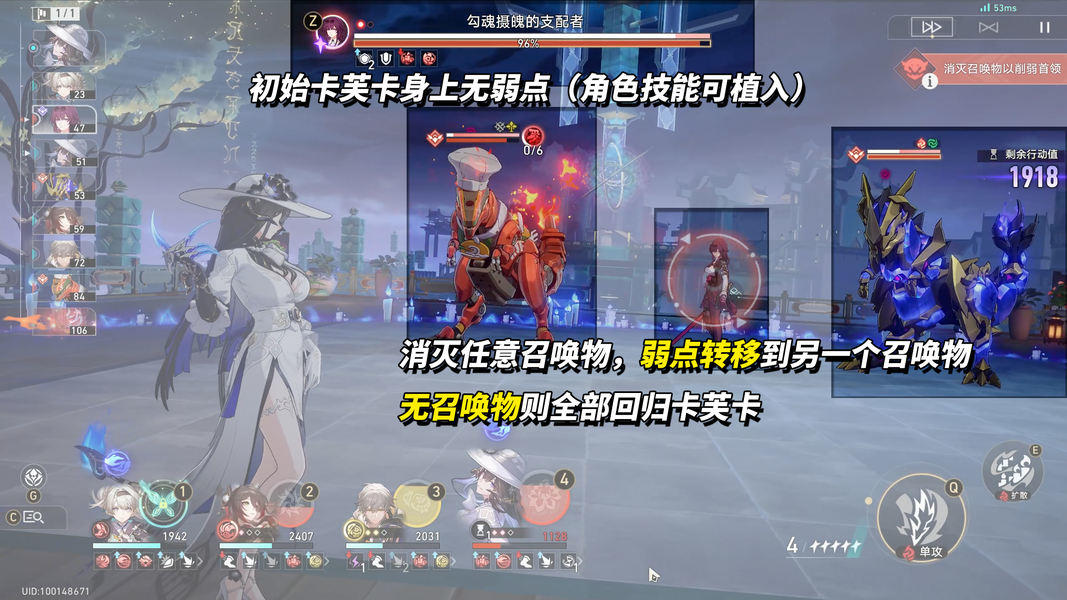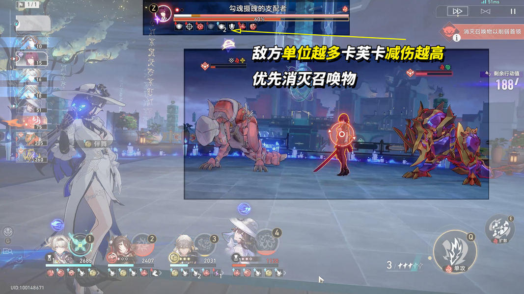 敌方单位数量越多,卡芙卡减伤越高。优先消灭召唤物,有利于出伤,避免提前击破首领,导致需要顶着高额减伤浪费这次爆发机会。