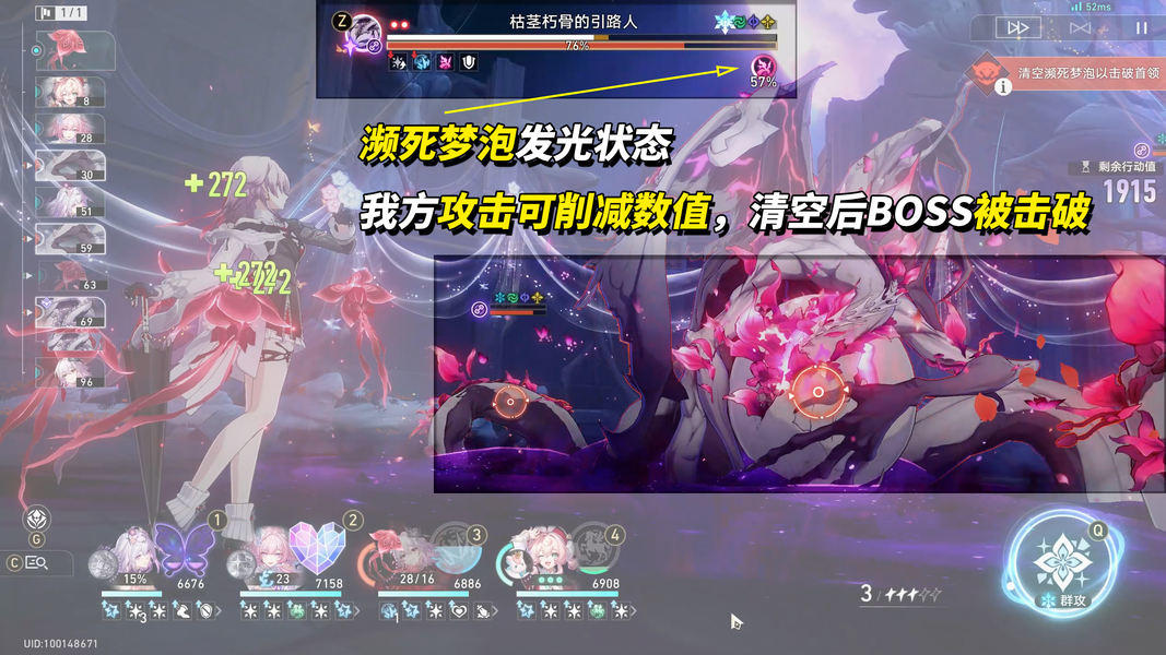 当它处于发光状态,我方造成伤害可降低“濒死梦泡”,清空后BOSS直接进入弱点击破状态;