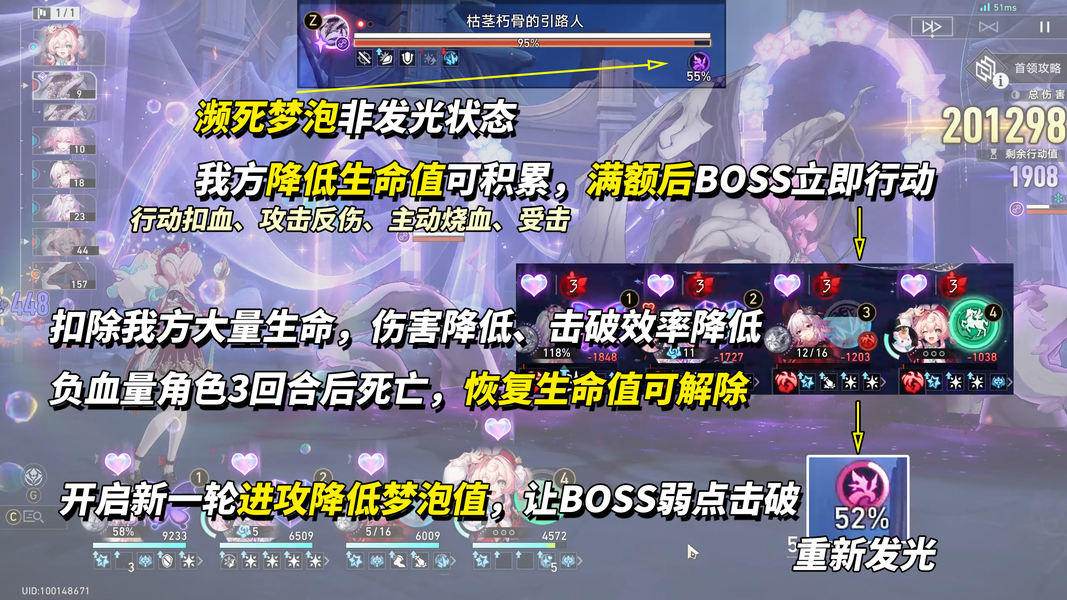 当它处于非发光状态,我方烧血/受击/行动/攻击反伤都会积攒“濒死梦泡”,满额后BOSS立即行动扣除我方大量生命值,生命值为负时造成的伤害、弱点击破效率都会大幅衰减,需搭配治疗角色恢复队伍生命状态。