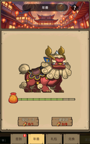 - 活动期间,玩家可以在宝库界面使用爆竹驱赶年兽并获得道具奖励