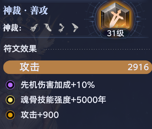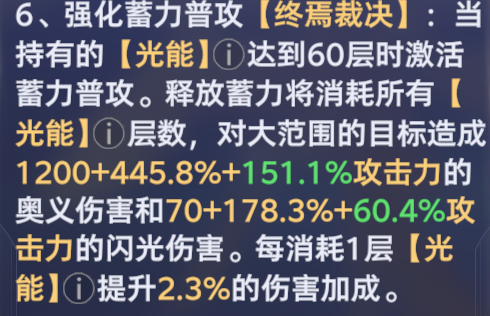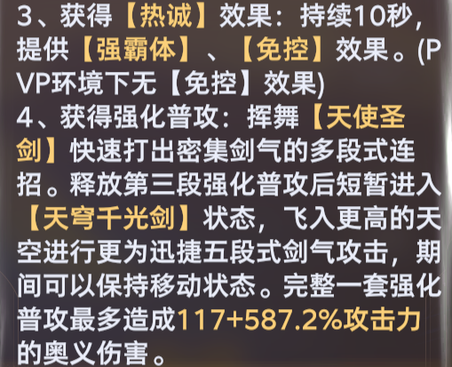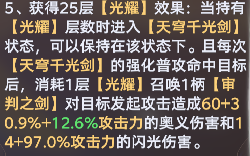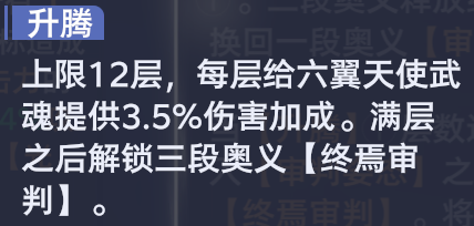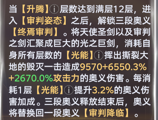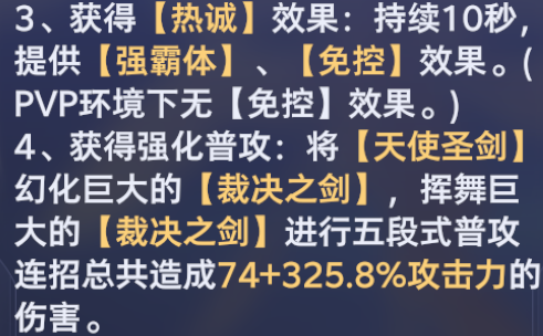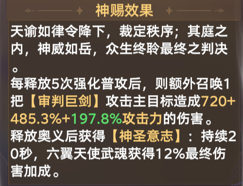 奥义4:每释放5次强化普攻后,则额外召唤1把【审判巨剑】攻击主目标造成720+485.3%+197.8%攻击力的伤害。释放奥义后获得【神圣意志】:持续20秒,六翼天使武魂获得12%最终伤害加成。