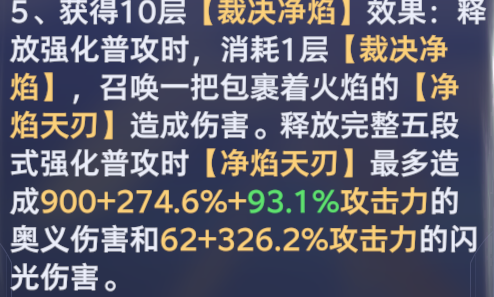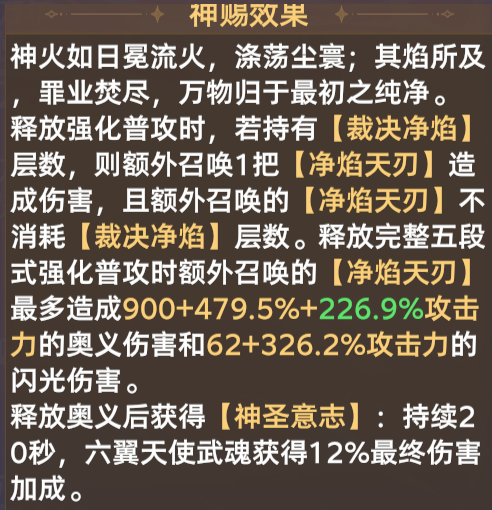 奥义1:释放强化普攻时,若持有【裁决净焰】层数,则额外召唤1把【净焰天刃】造成伤害,且额外召唤的【净焰天刃】不消耗【裁决净焰】层数。释放完整五段式强化普攻时额外召唤的【净焰天刃】最多造成900+479.5%+226.9%攻击力的奥义伤害和62+326.2%攻击力的闪光伤害。释放奥义后获得【神圣意志】:持续20秒,六翼天使武魂获得12%最终伤害加成。