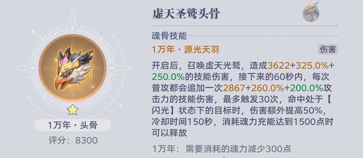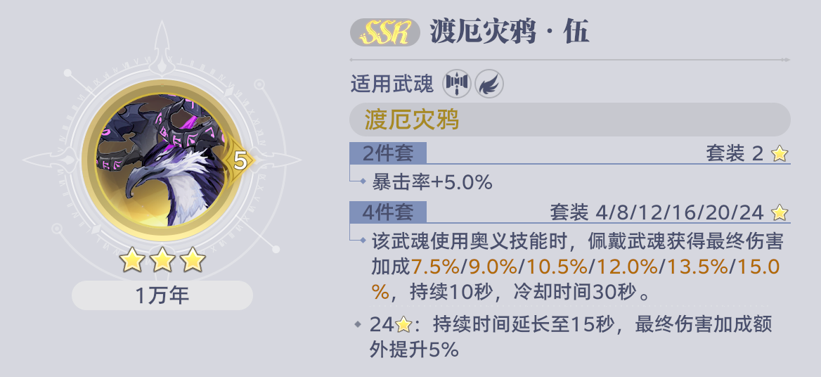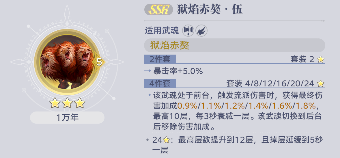 终局审判(第四魂环·奥义):分为起手式【审判降临】、升腾式【终焉之火】与终结式【终焉审判】,可实现多次变身,叠加【升腾】状态强化长线输出能力。