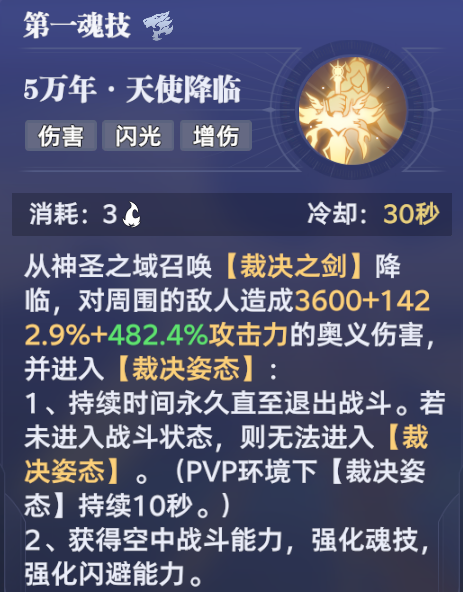 天使降临(第一魂环·奥义):释放后获得10秒【热诚】(霸体免控)与永久【裁决状态】(飞行+强化普攻/蓄力普攻),并获得10层【裁决净焰】,强化普攻消耗【裁决净焰】召唤【净焰天刃】造成额外伤害。
