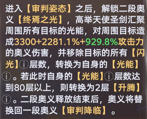 第二套(长图续航流):以奥义【终局审判】为核心。一段开启变身叠加【闪光】,二段吸收全场【闪光】转化为【光能】并叠加【升腾】状态,满层【升腾】后解锁三段打出终结伤害,后续可无限释放二段,适配长线战斗。