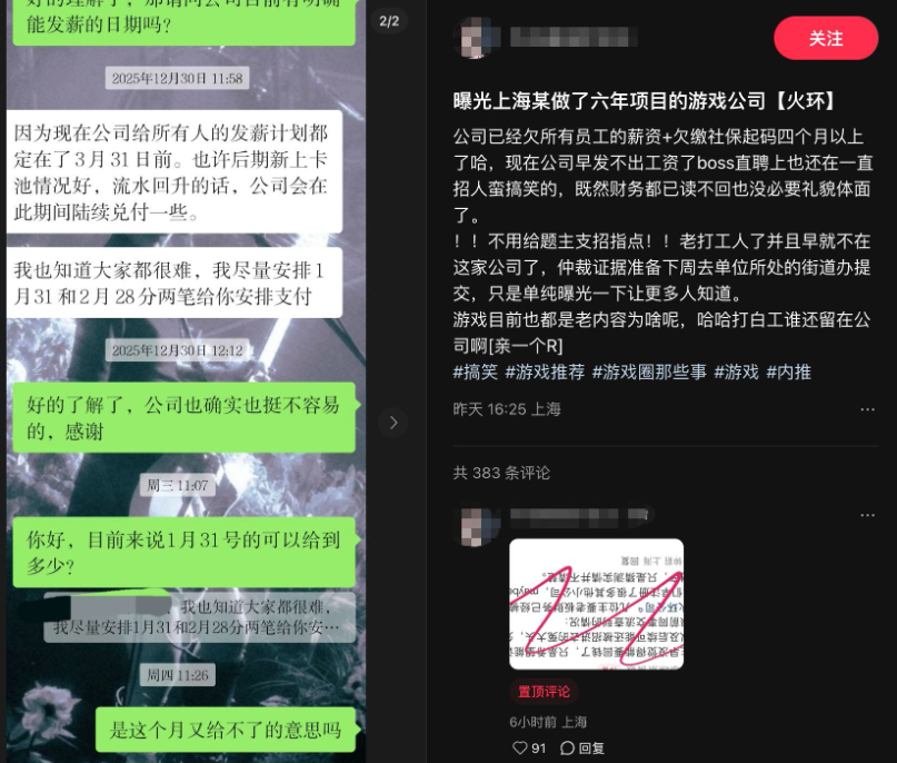 公测两月陷欠薪风波!《火环》研发商被曝拖欠薪资社保超四月!