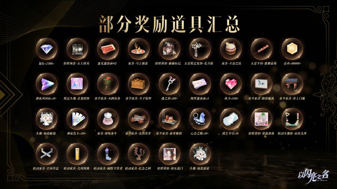 3. 预约人数目标达成奖励!以闪亮之名预约集结目标现已达成,我们将会如约向每一位启程闪亮之旅的合伙人发放预约期间的各项奖励!合伙人通关主线之旅普通关卡第一章后,即可在邮件中领取包含璀璨邀请函*10、4星饰品-栀子、聊天背景、家具、拍照场景、拍照特效、称号等豪华奖励!