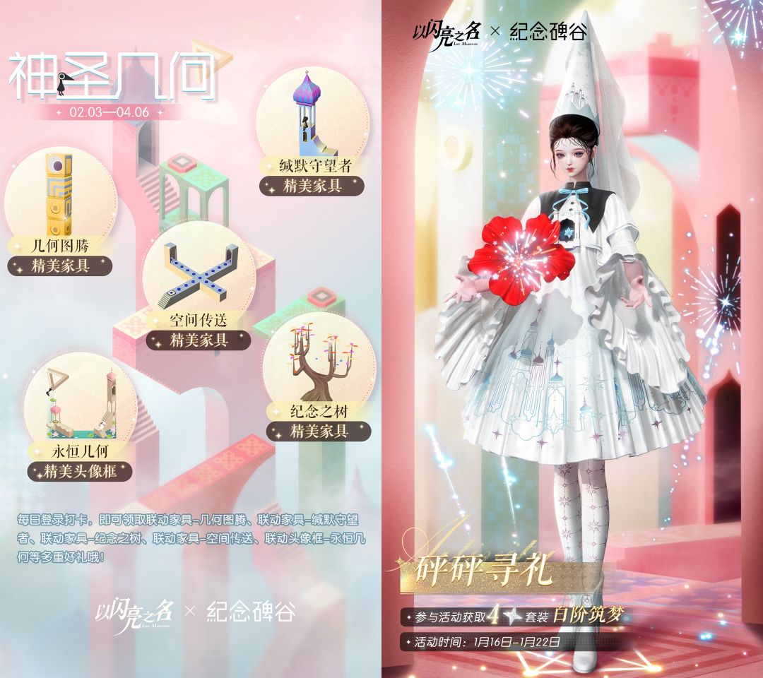 4.以闪亮之名X纪念碑谷限定联动也将在春节期间登场,参与联动活动,即可免费领取纪念碑谷联动四星套装【白阶筑梦】,联动家具【神圣几何图腾柱】、【红高塔和乌鸦】、【神圣大树】、【十字传送门】、联动头像框【永恒几何】等多重好礼!