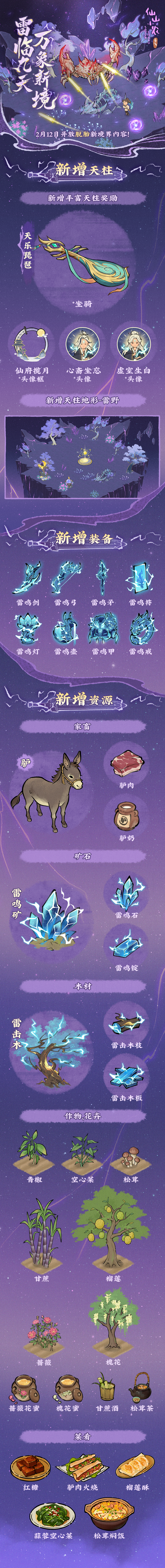 💫本次更新将开放全新天柱地形-雷野。小农可在新增天柱探索中获得天乐琵琶(坐骑)、仙府揽月(头像框)、心斋坐忘(头像)、虚室生白(头像)等奖励!