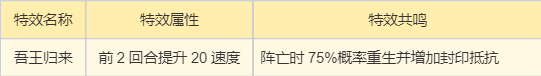 首选【吾王归来】(版本 T0 级特效):前 2 回合提升 20 点速度,阵亡时 75% 概率重生并增加封印抵抗,既强化先手输出,又弥补物理输出身板脆的短板,更利于鬼王稳定输出。