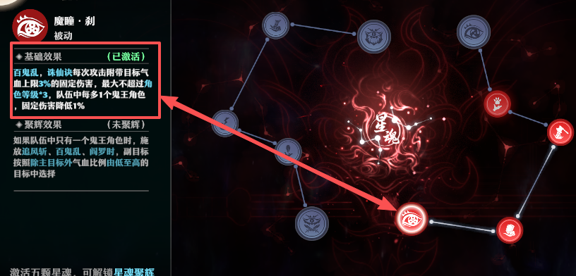 · 魔瞳・刹:【百鬼乱】【诛仙诀】每次攻击附带目标气血上限 3% 的固定伤害(最大不超过角色等级 ×3);队伍中每多 1 个鬼王角色,固定伤害降低 1%;