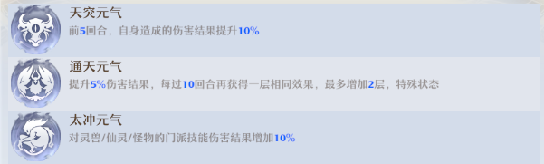 【太冲】:对灵兽、仙灵、怪物的门派技能伤害结果增加 10%,PVP 与 PVE 场景均适用;