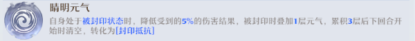 【晴明】:自身被封印时降低 5% 受到的伤害,被封印期间叠加元气,累积 3 层后清空并转化为【封印抵抗】,减少被控对输出的影响。