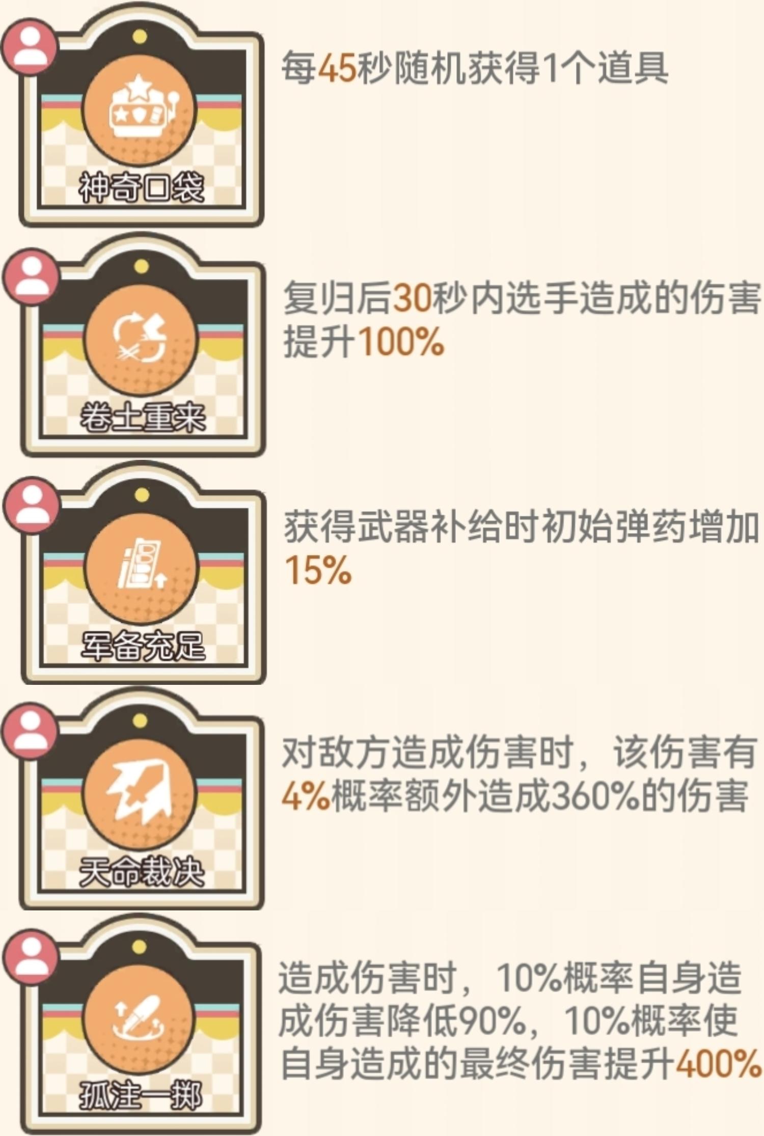 个人建议手部乘区数值不高的玩家不要选减血增伤的【殊死血战】,可以选择射击回血的【嗜血冲击】来增加生存容错率。【灼热标记】buff非常强力,如果有就选。我个人还喜欢选择【循环弹仓】配合武器物资箱中的霰弹枪来使用,配合技能,直接猛猛射