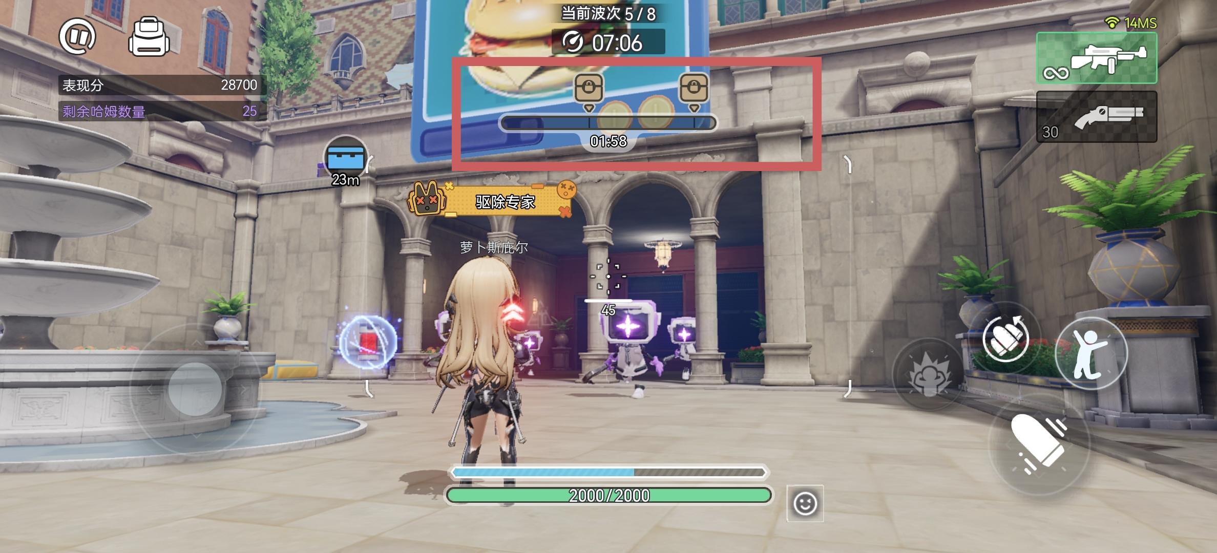 关卡方面,总共需要守住8轮哈姆进攻,每一轮进攻开始前能够选取一次增益buff。在第2、4、7轮进攻结束后会在5个固定点位刷新道具。在第3、6轮进攻结束后会在4个固定点位掉落武器物资箱,能够获取榴弹炮和霰弹枪。8轮进攻中会出现一次奖励关卡,在限定时间内击杀奖励关的哈姆能够在下一轮进攻开启前额外选取三次增益buff(加上原本能够选取的次数也就是四次)。奖励关会在第4~6轮之间随机出现。