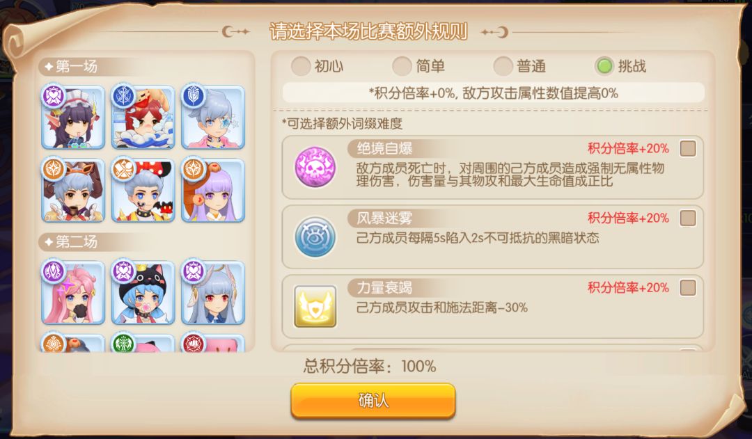 3、在比赛正式开始前,队长可选择本场比赛的额外规则,包括调整对手的强度,选择部分词缀效果以增强或限制彼此的行动。