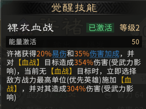 郭嘉的天赋【十胜十败】可为许褚附加【胜机】效果,使其额外发动两次天赋【背水一决】,从而更快积累觉醒值,直接发动觉醒技能【裸衣血战】,实现快速定点爆发。