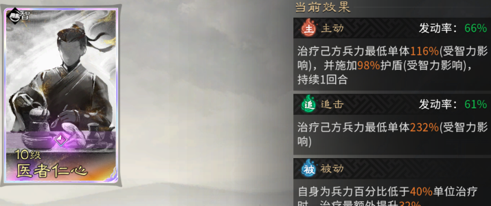 主动技能固定携带【医者仁心】,为己方当前兵力最低的单位同时提供治疗与护盾,有效防止其被快速击倒,从而增强队伍整体的续航与生存能力。