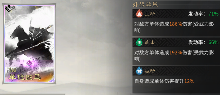 追击技能和被动技能都固定携带【单枪匹马】,其追击效果可打出高额单体爆发,被动效果则永久提升单体伤害,两者叠加能显著增强对单一目标的压制力。