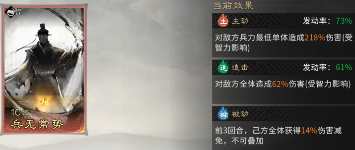 被动技能固定携带【兵无常势】,前三回合,使己方全体获得14%的减伤,直接提升队伍整体承伤能力。