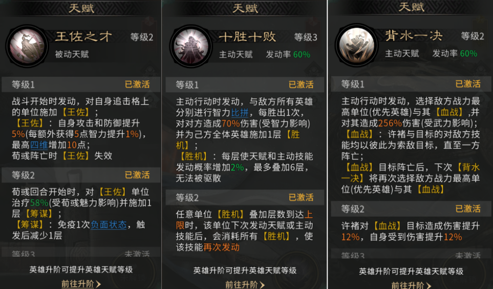 荀彧的天赋【王佐之才】可为许褚提供10点武力与5%攻击力的直接提升,显著强化其输出面板,帮助许褚打出更高额的伤害。