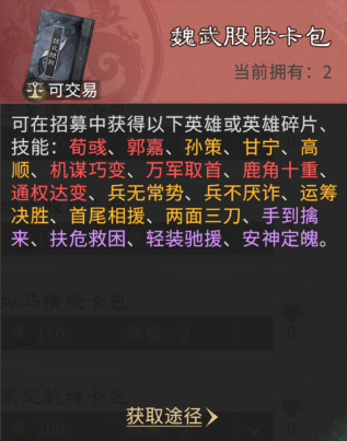 养成提醒:虽然阵容中有2个绝世武将荀彧和郭嘉,但是荀彧和郭嘉都是出自魏武股肱卡包,降低了获取难度。许褚可以用每日活动给的宝箱,开出许褚。