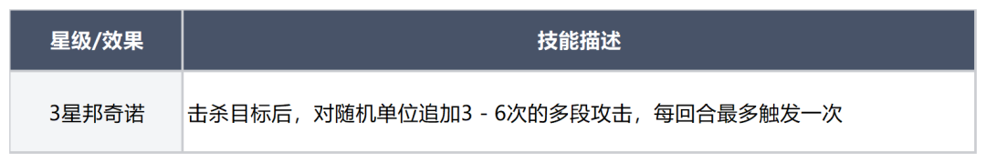 2代邦奇诺3星图腾效果强化了2代邦奇诺作为输出的定位,它将能快速触发天赋,且有可能收割敌方剩余单位者,扭转战局,对敌方造成强劲的承伤压力。