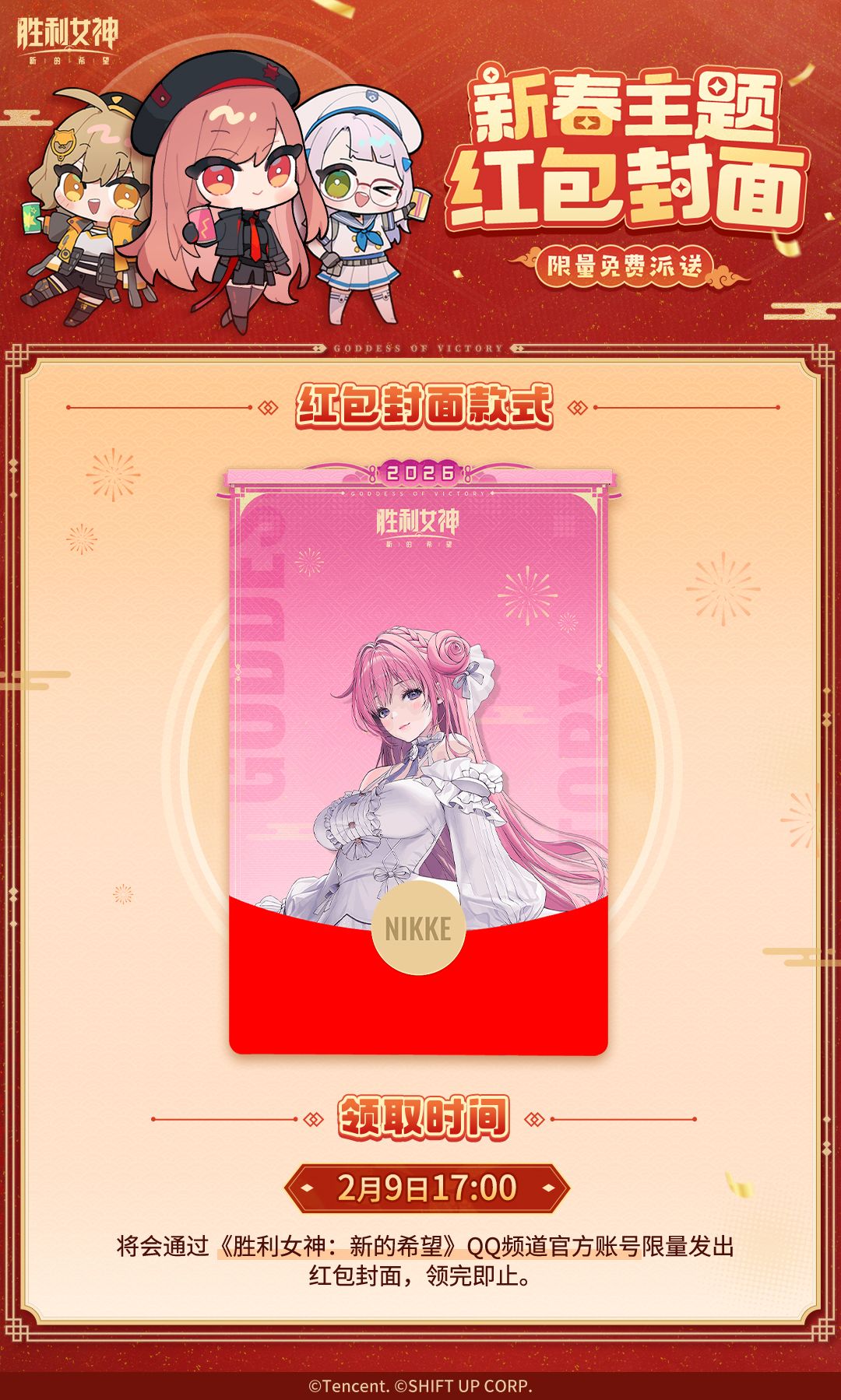 2/9日 下午17点,前往QQ频道【胜利女神新的希望】,我们还会通过官方账号限量发放以下款式QQ红包封面。